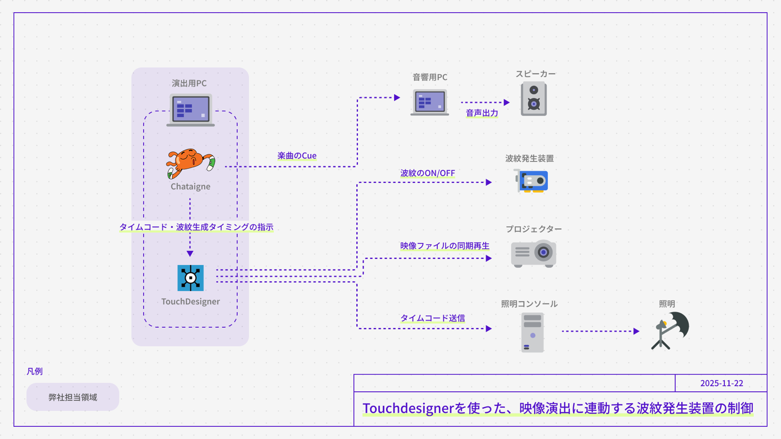 Chataigneのタイムラインを基準としてTouchdesignerから映像を送出し、同時に水槽に設置された波紋発生装置のON/OFF制御を行いました。マルチチャンネルの音響システムと照明演出は別チームが担当していたため、キュー出しやタイムコードを送信することで連携を実現しています。