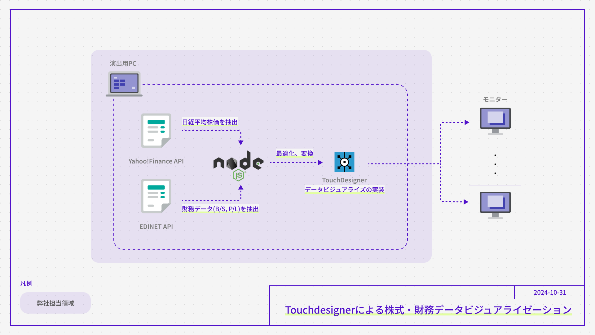 本件では、Node.jsで整形した株式、財務データを使って、TouchDesignerによるデータビジュアライズ表現を実装しました。