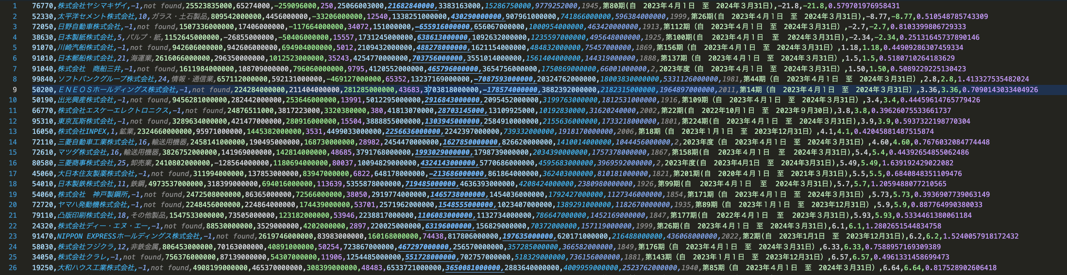 TouchDesignerへデータを渡す前段階としてNode.jsを使用しています。Yahoo!Finance APIからは日足の日経平均株価、EDINET APIからはB/SとP/Lに含まれる売上や資産、負債など主要な財務情報をピックアップしてCSV形式に落とし込みました。
